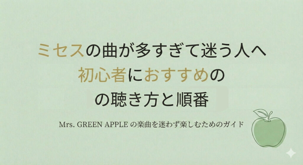 Mrs. GREEN APPLEの曲が多くて何から聴けばいいか迷っている初心者向けに、無理なく楽しめるおすすめの聴き方と順番を分かりやすく紹介します。 -